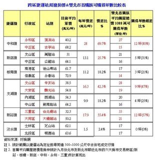 而捷運差一站房價差很大的,還有新莊線的「台北橋站」與「大橋頭站」,為價差第二大,可購得坪數相差5成7,第三名則是文湖線的「辛亥站」、「麟光站」,兩者相差9坪之多,坪數也有4成7的差距。