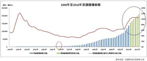 但是在房市還沒恢復之際,另外一個大泡沫已經吹起,就是美國國債泡沫。從下圖得知,美國國債在2000年後,就以非常快的速度成長,佔GDP比重大約只佔40~50%左右。但是在2008年後,舉債大增以外,國債佔GDP比例節節升高。目前檯面上的國債已經有16兆美元,國債佔GDP已經接近100%。(超過100%通常會演變成不可逆反應,因愈來愈付不起利息而債滾債,造成國債崩盤。例如:希臘。)