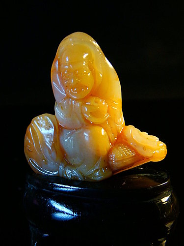 第六,打蠟油養,因石而異 打蠟、油養是壽山石養護的一個重要手段,但是並非所有的壽山石都可以不假思索地油養。不同品種的壽山石,保養方法是不盡相同的。 田坑石,溫潤可愛,石性穩定,無需過多抹油。時常摩挲把玩,既能養石,又可養性。 水坑石,質堅通靈,以色清為貴,只要經過認真打磨揩光,不受硬物碰擊,即可保持晶瑩,不必時常擦油。 山坑石中的高山石,質細而通靈,石色豐富,鮮豔多彩,但是石質稍松,每遇炎夏酷暑或秋冬氣燥,表面容易變得枯燥,甚至出現裂紋,色彩也變得黝暗無光,所以人們從給它起了個很恰當的外號,叫“財主石”。使用這類“財主石”刻制的雕刻品,保養方法頗講究,一般以油養為上。其方法是:先用軟刷清除石表灰塵,如果油污很厚,難於清除,可先用溫堿水沖洗,直到完全乾淨。待乾燥後,再用脫脂棉花團包裹細綢布,蘸少許白茶油塗擦各個部位,即能使石質復發光彩。上油後的石雕品要陳設於玻璃櫃中,或加玻璃外罩,減少灰塵沾染,同時還要注意避免陽光直射或長時間強烈的燈光照射,以防石質變燥。此外,為了保持其潤澤,還需在附近放幾杯水讓水蒸發,增加周圍空氣的濕度。 有些石種不宜採用油養法,如芙蓉石潔白細嫩,沾油則漸灰暗,失去光彩,所以,切忌與任何油質接觸。平日撫玩,也應保持手掌乾淨無油污。如果放在潔淨的臉龐或鼻翼兩側輕擦,讓微量的脂肪油保養,最為適宜。壽山石中的老嶺石、柳坪石等不通透的粗質石,刻製成雕品後,外表最好進行一次上蠟揩光技術處理。經過打蠟後的壽山石,石性穩定,無需再進行油養,但珍貴的壽山石切忌隨意加熱和打蠟,不然有失“石性”。