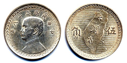 2.伍角銀幣----這是政府遷台後發行的第二枚硬輔幣,它也是1949年12月1日發行的,直徑24mm,重5.0公克,72%銀及銅組成,正面圖案:上沿「中華民國三十八年」,中間「孫中山半身頭像」,四週環以花紋;背面圖案:中間鐫有「台灣地圖及台灣省」字樣,兩旁由右至左鐫有「伍角」字樣,四週也環以點邊,發行量不詳。