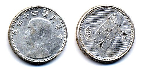 5.壹角鋁幣----這是政府遷台後發行的第五枚硬輔幣,它也是1955年7月4日發行的,直徑19mm,重1.15公克,99%鋁合金組成,正面圖案:上沿「中華民國四十四年」,中間「孫中山半身頭像」,四週環以小點;背面圖案:中間鐫有「台灣地圖及台灣省」字樣,兩旁由右至左鐫有「壹角」字樣,四週也環以小點,發行量約583,980,000枚。
