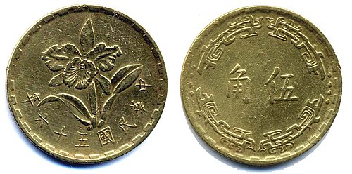 2.蘭花版伍角----另一種是伍角銅幣,都是在19671974年間的產品,直徑23mm,重3.7公克,正面是洋蘭及中華民國發行年份,背面是蝙蝠圖案及面額幣值,錢幣不分鑄造年份,一共也發行了五枚。