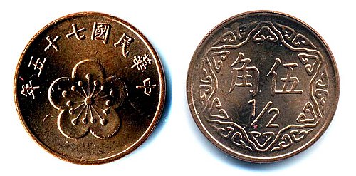 4. 梅花版伍角----自民國70年(1981年)發行的伍角紅黃銅幣,共發行了三種(民國70年,75年,77年),直徑18mm,重3.0公克,正面中間是五瓣梅花,上沿有中華民國發行年份,背面是幾何圖形環繞,中間標明中文「伍角及1/2」面額。
