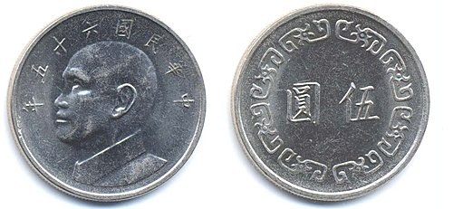 1.民國59年(1970年),發行了一種伍圓大型人像版----(直徑2 .9分),重9.5公克,為鎳合金幣,正面是中華民國發行年份及總統蔣中正肖像。背面是蝙蝠圖案環繞,中間鐫有伍圓的鎳合金幣,自19701979年間共發行了十枚,現已退出流通系列。