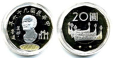 (六)「中華民國建國九十週年流通紀念幣」----正面上沿是「中華民國建國九十年紀念」,下沿是「19112001」,中間是「國父半身像」,背面是隱藏「國運昌隆」、「梅花與雙廿」及「10圓」字樣。