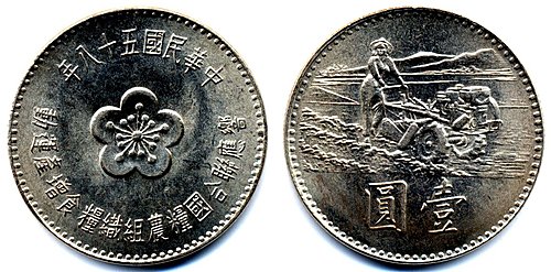 (二)1969年發行了「農糧增產紀念幣」----全套一枚,正面上沿是「中華民國五十八年」,下沿是「響應聯合國糧農組織糧食增產運動」,中間是五瓣梅花圖案,背面是農夫機械耕田圖案,下沿鐫有「壹圓」字樣。