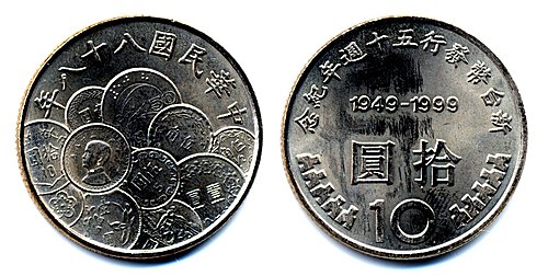 ,背面是「新台幣發行五十週年紀念」, 「19491999」,「拾圓及10」,下沿左右兩旁各有五座中央銀行行徽圖案。